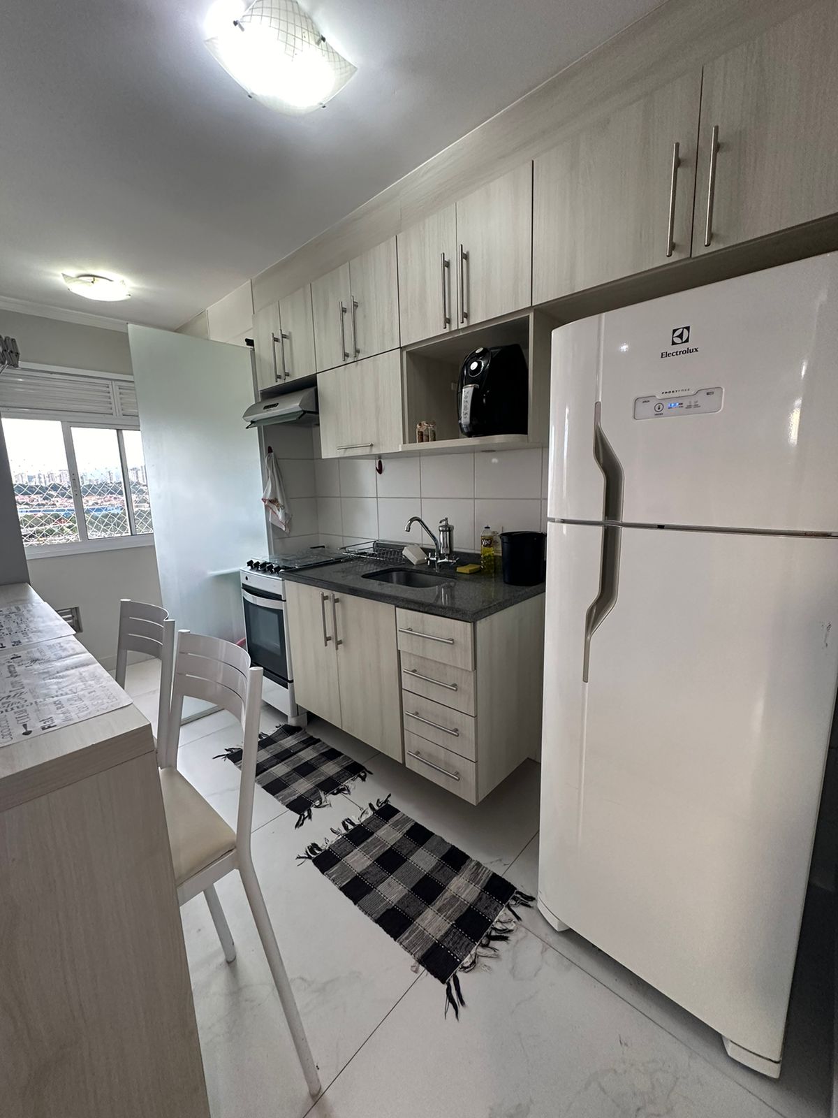 Apartamento com vista. Face norte, com sol na parte da manhã. Banheiro conta com chuveiro e espelho, além do metal e louça de primeira. O imóvel está em excelente estado de conservação e conta com móveis planejados na lavanderia, cozinha, sala, quarto e banheiro. Cozinha e banheiro com porcelanato branco, lindo! Água e gás inclusos no condomínio.