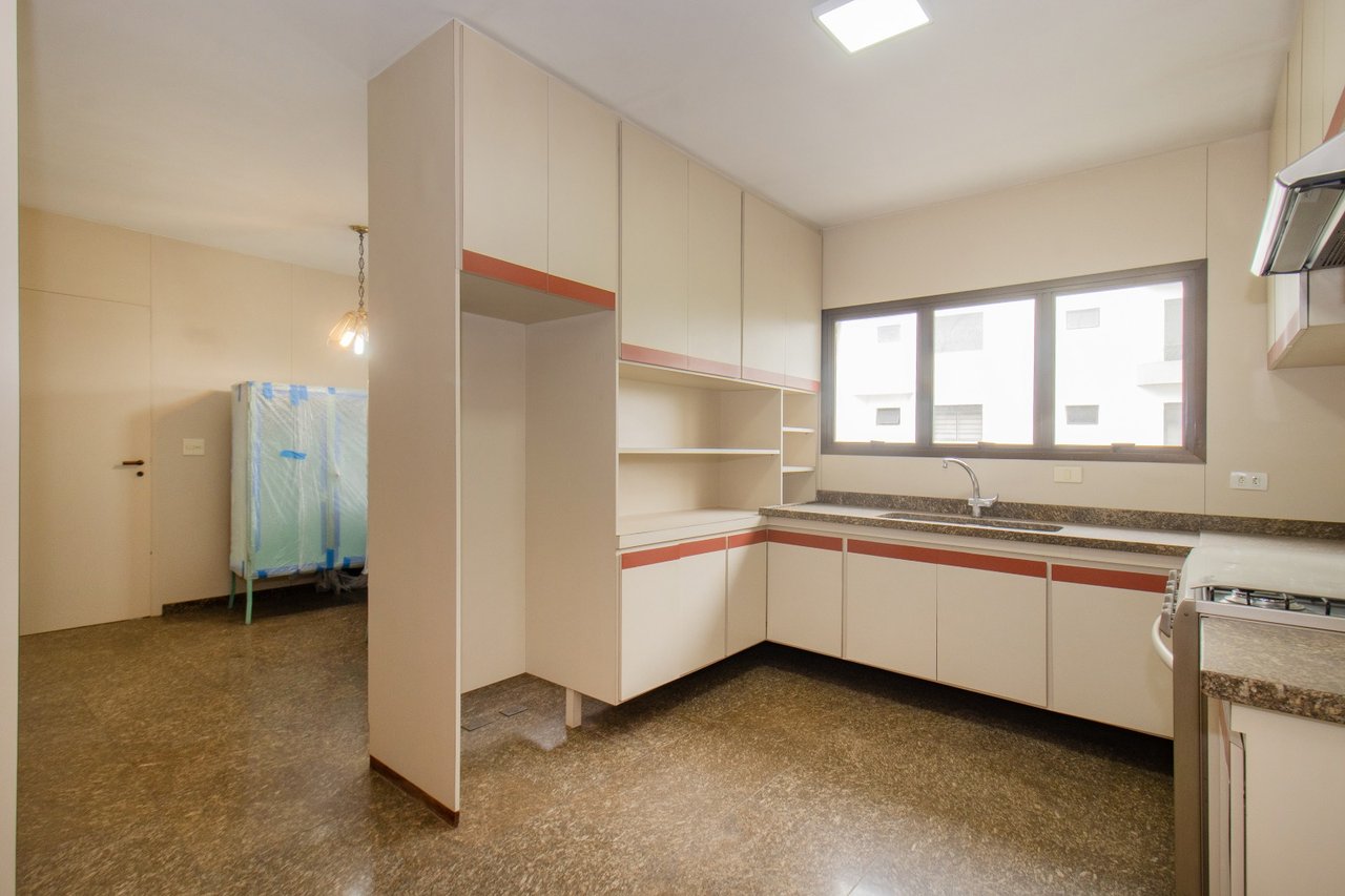 A cozinha é generosa podendo facilmente ser dividida em área de copa confortável e ainda manter cozinha ampla e funcional, além de área de serviço grande e independente com banheiro de apoio e quarto de serviço versátil, assegurando praticidade no cotidiano.