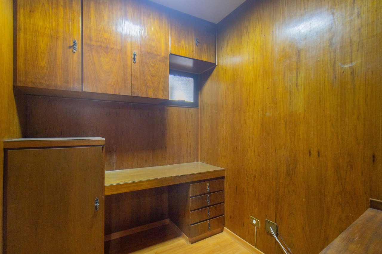 Um dos quartos de serviço, aberto para a área intima foi estrategicamente convertido em um escritório prático acrescentando ambiente ideal para estudos e trabalho em casa.