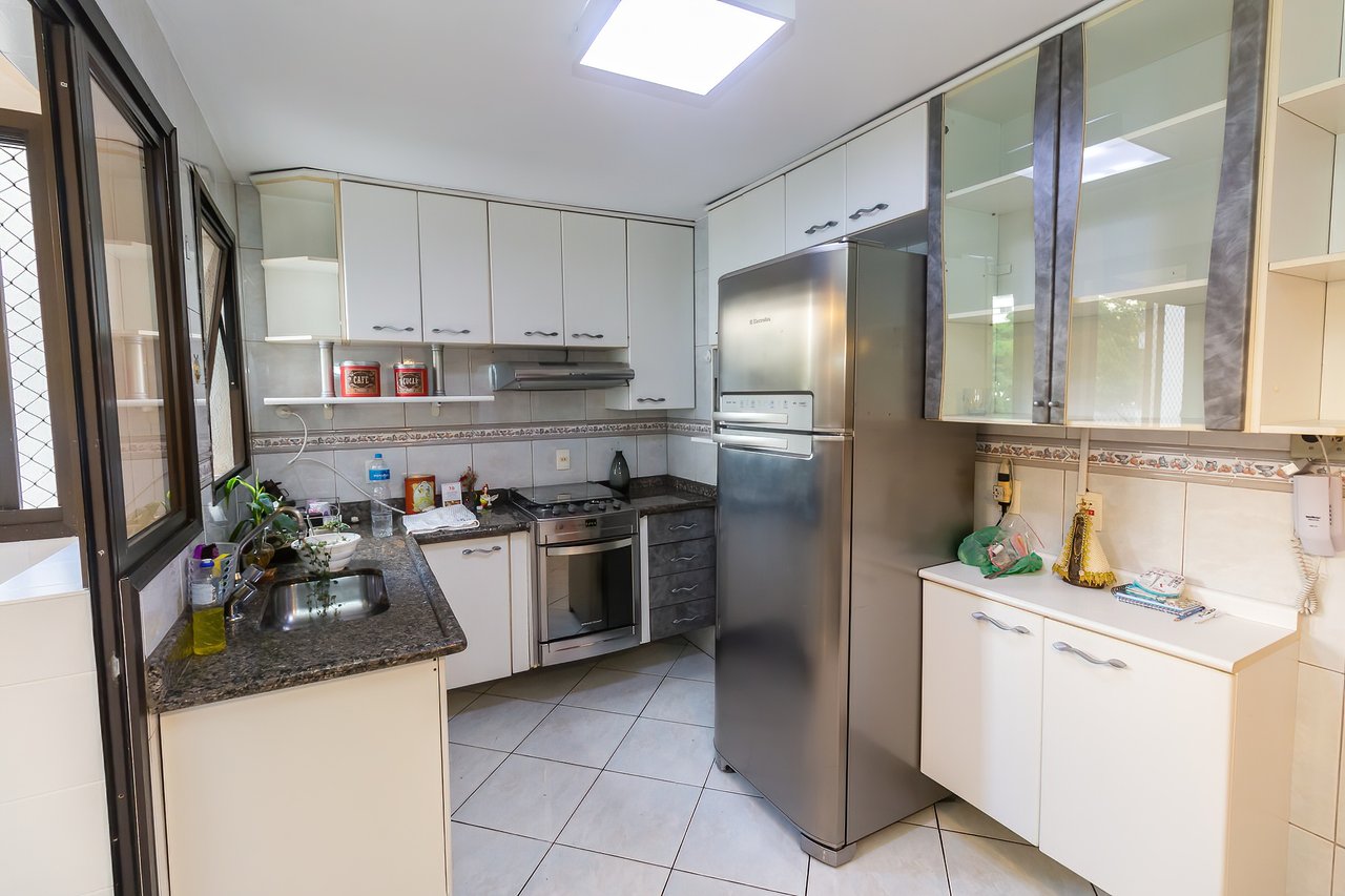 A cozinha com copa integrada é bem iluminada, planejada e funcional, equipada com armários sob medida que otimizam cada espaço. A área de serviço é completa e inclui dependência para funcionários.