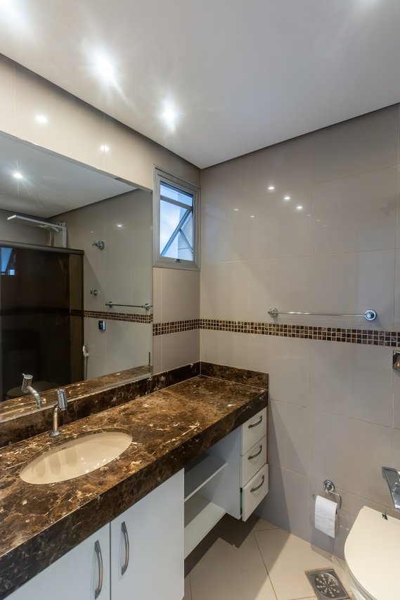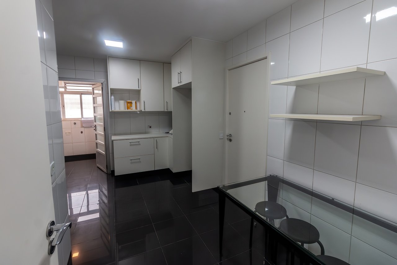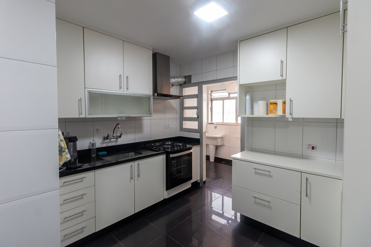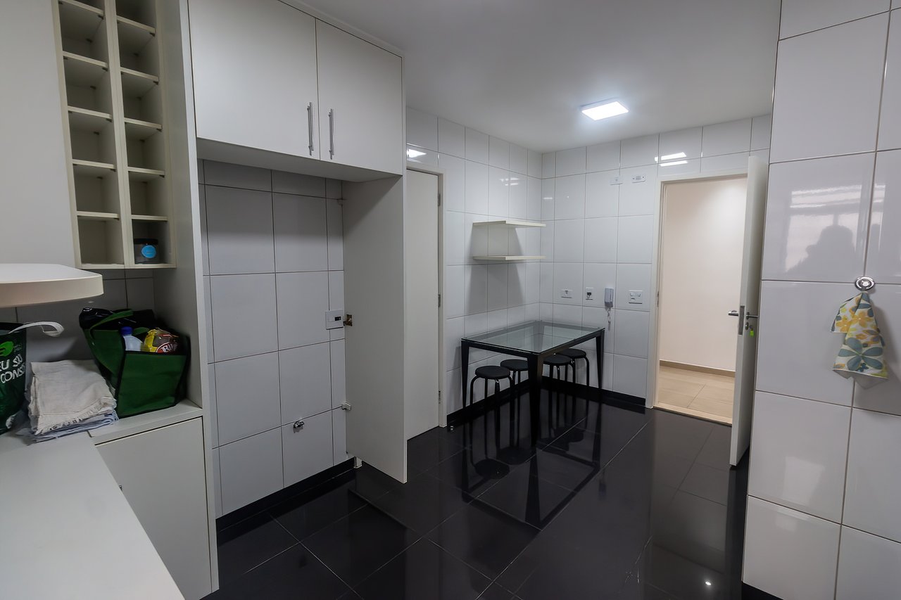 A cozinha e a copa integradas oferecem ótimo aproveitamento de espaço e funcionalidade, com muitos armários e boa ventilação. O imóvel conta ainda com banheiro social, área de serviço completa, banheiro e quarto de serviço, além de uma vaga de garagem.