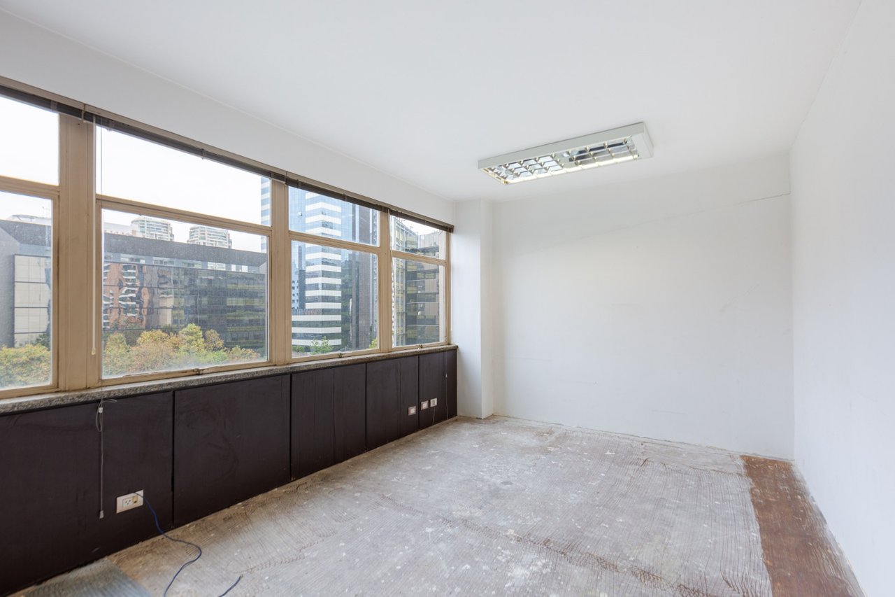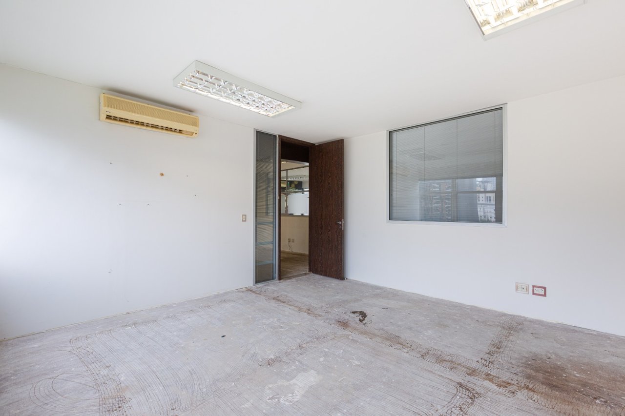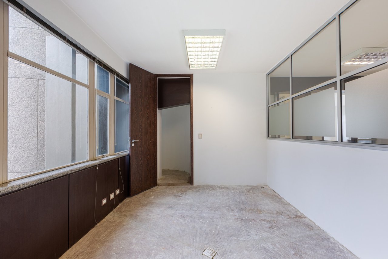 Conjunto comercial de 234 m² com recepção, sete salas fechadas com acabamentos em madeira;