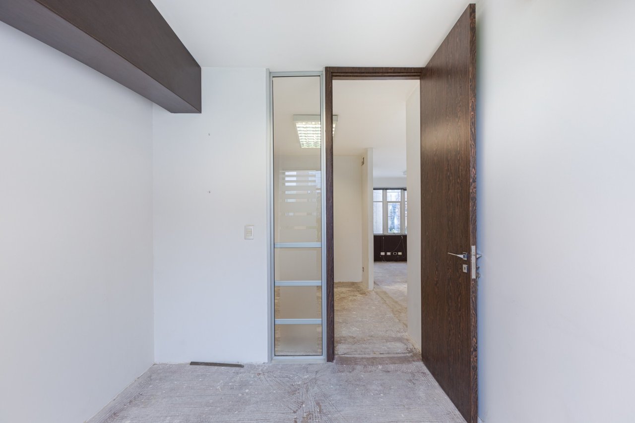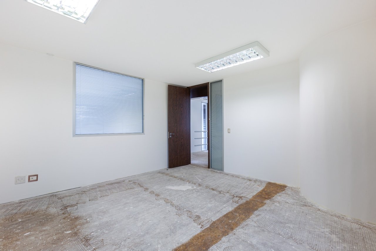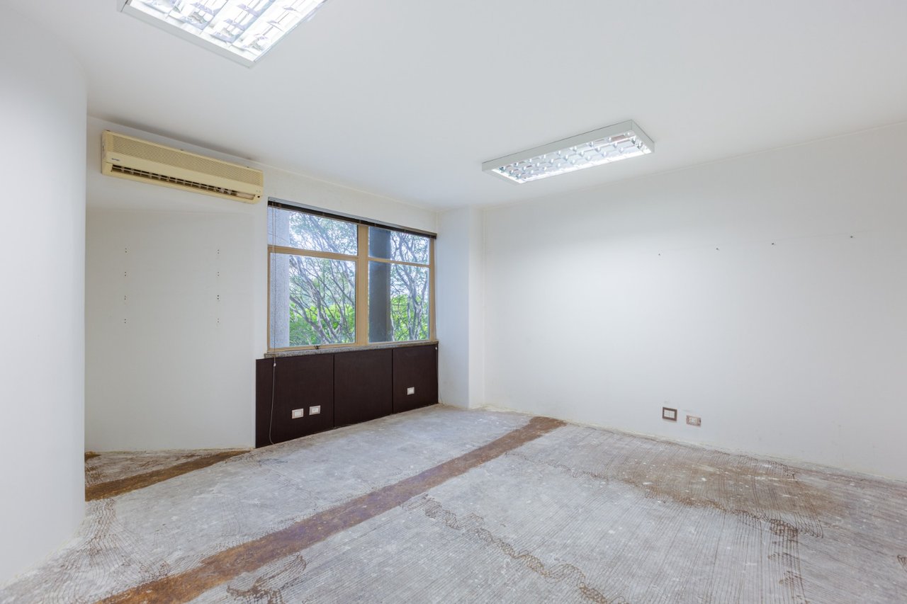 Conjunto comercial de 234 m² com recepção, sete salas fechadas com acabamentos em madeira;