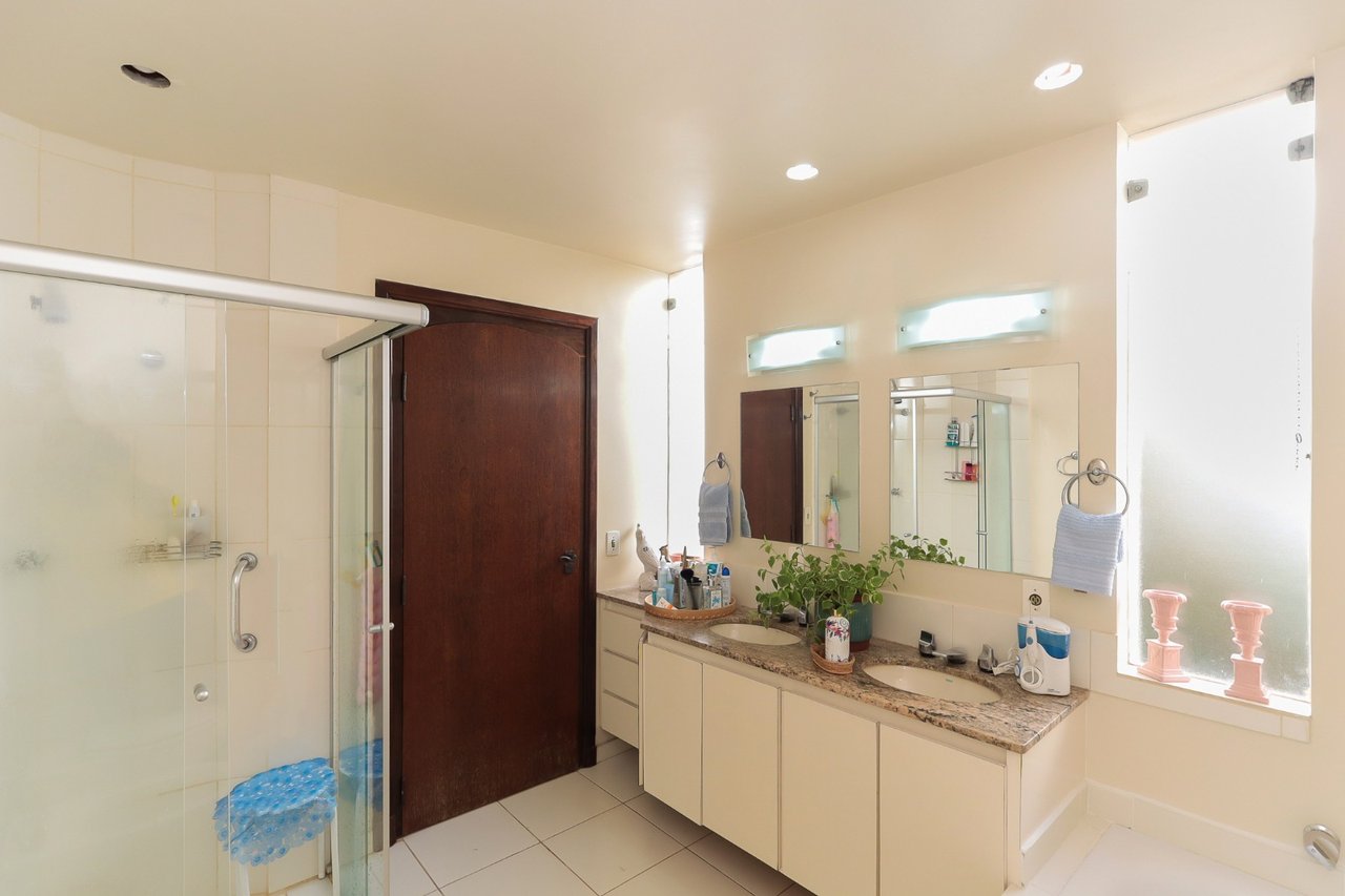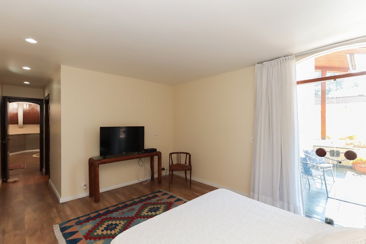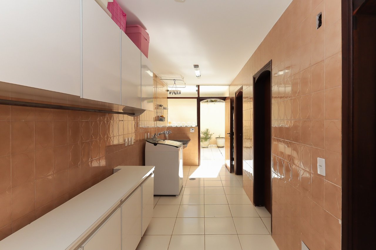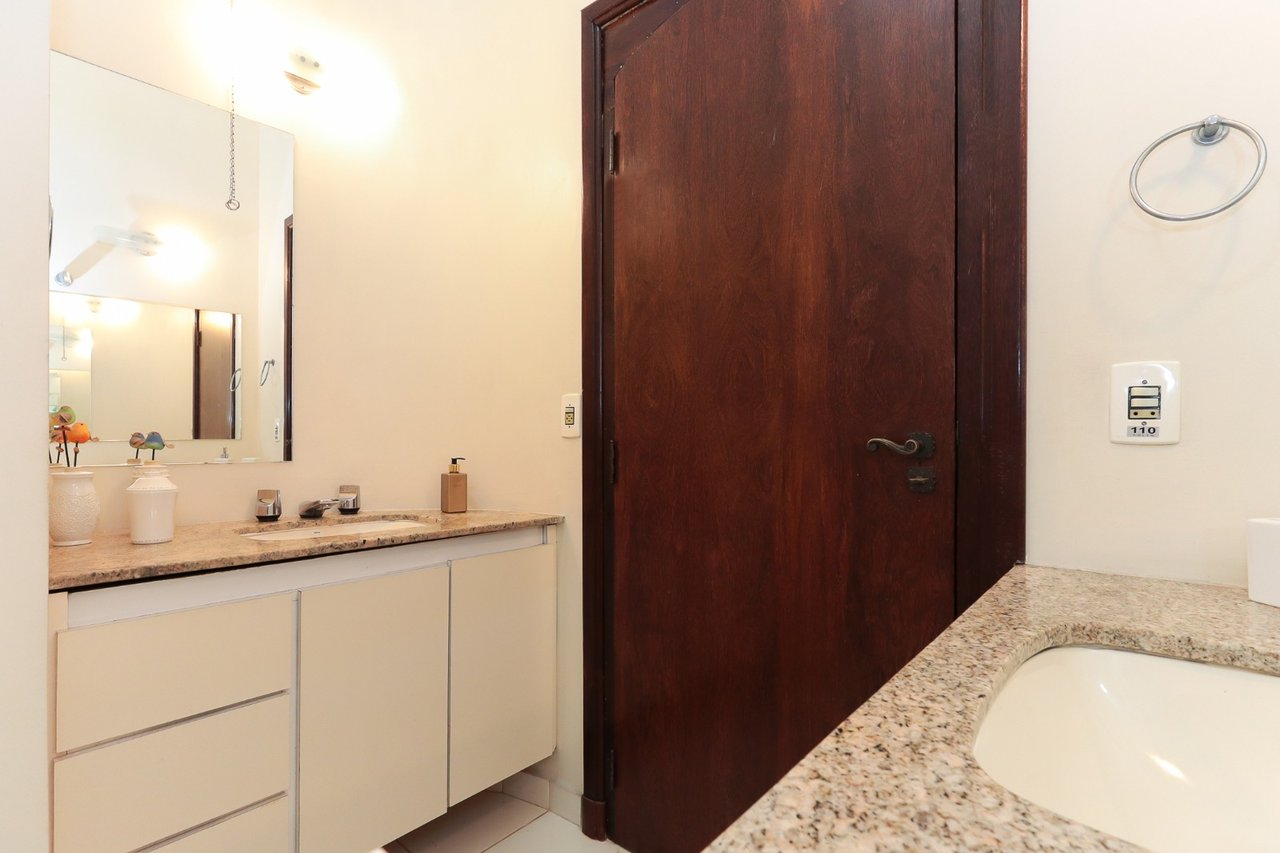 - Duas suítes completas e três dormitórios, sala de almoço e jantar, cozinha, living para dois ambientes com sala de televisão, escritório, lavabo e ampla área de serviço com departamento para funcionário(a)