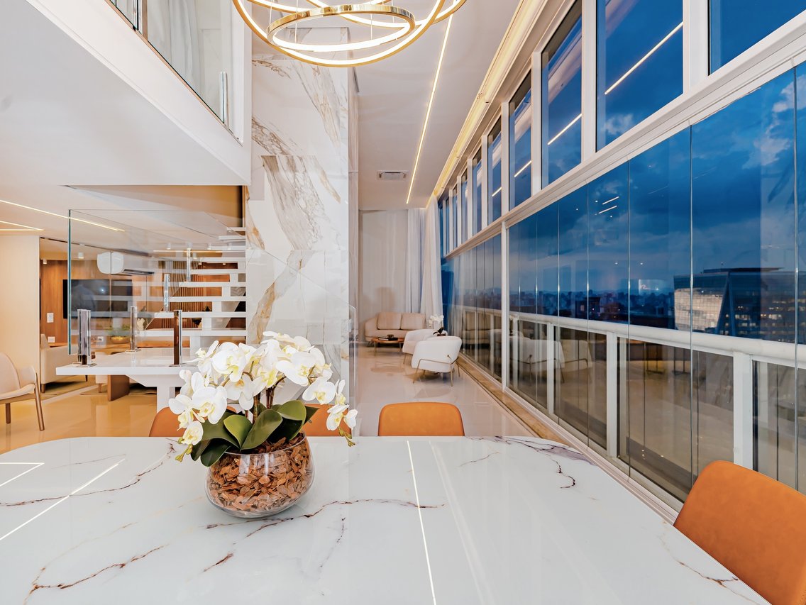 Apartamento Duplex 172 metros, localizado no 36° andar totalmente decorado e mobiliado com projeto de interiores, pronto para morar. Sendo 2 suítes com mais 1 lavabo. Paleta de cores em tons branco e cinza, junto com o porcelanato marmorizado em contraste com o grande pendente da sala de jantar com pé direito duplo. Todos os pisos em porcelanato branco polido, cozinha integrada com sala de jantar com 6 lugares e sala de estar.